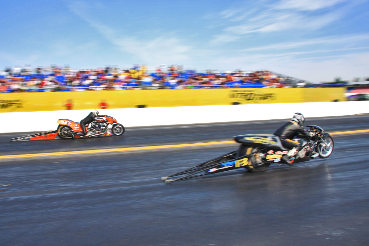 С мотобайками тоже не все просто. Есть категория Nitro-Bike Thunder, куда попадают Top-Fuel и Super Twin Top Fuel, монстры с измененной формой кузова, использующие в своих двигателях мощностью до 900 л.с. в качестве топлива нитрометанол и легко выезжающие на 402-метровом стрипе из 7 секунд. Pro-bike Eliminator — это немного более «медленная» категория, их среднее время прохождения дистанции 7-8 секунд, и для повышения мощности двигателя они используют закись. Далее идут классы SuperStreet Bike — тоже быстрые (порядка 7,5 секунд), но без кузовных изменений; Super Twin Top Gas и V-Rod Destroyer Cup. Последний класс касается только мотоциклов марки Harley Davidson: их времена колеблются в пределах 9 секунд, а лучшая зафиксированная скорость составила 240 км/ч.
