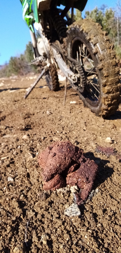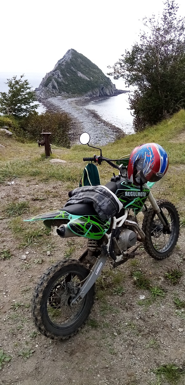 в тех местах я был лет 10-15 назад, так что нынешнее состояние дороги было сюрпризом: дорога просто полная жопа. всё поразмывало к чертям. а на крупных камнях, которые остались после размыва, я скакал как лягушонка в коробчонке. напомню, что у меня китайский питбайк Регулмото 125 кубов. на некоторымх участках просто включал 1-ю передачу и вёл байк пешком, благо заниженная коробка это позволяет. оценил сочетание отличной тяги мотора с низов и непродуманности газа: на 1-й передаче малейший поворот гашетки вызывает резкий рывок, что при переезде препятствий не просто неудобно, а пару раз заканчивалось тем, что байк и я лежим на дороге отдельно, при этом я соображаю целы ли кости и как побыстрей встать и его заглушить.
