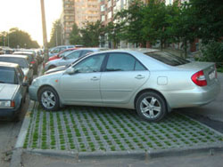 видел ЗАМЕЧАТЕЛЬНОЕ решение в москве: в землю с газоном вдавливают пластмасовые решетки зеленого цвета(чтоб с травой сливалось) с ячеей примерно 5 см. но при этом решетка на 2-3 см выше земли. газон растет сквозь ячеи а машины заезжают на решетку (фактически) . тоесть ставят на газон но он всегда зеленый