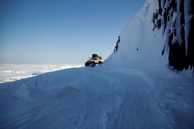 Снег и лёд возле океана совершенно другой. На улице около ноля, а он сыпучий и вязкий. Машины идут тяжело.