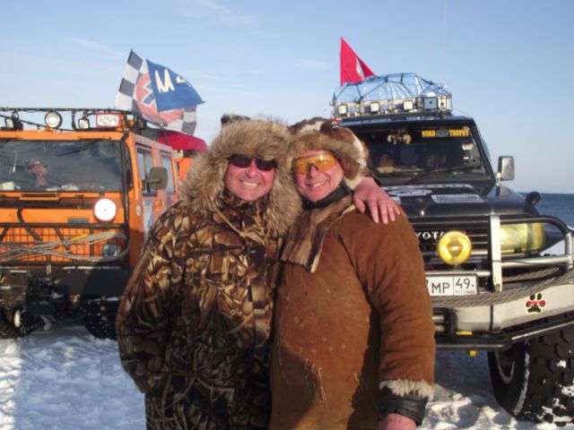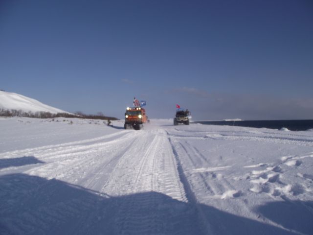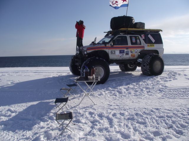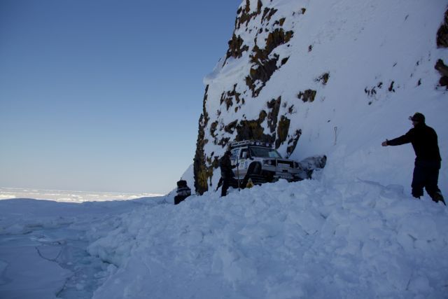 Вместо гусянок назад установили на задний мост Паджеро "масенькие" 35-ые колёсики и полезли в о.!.!.у До подъёма выдохнули. А вот тут-то и потратили пельменные калории на лопаты часика за 3. Однако Сохатый даже без прицепа не взял высотку. Вот он звёздный час АнатлеНиколаемобиля. Они слегка подровняли лопатами тычок слева и поползли вверх. Но и тут без лебёдки не обошлось. Закопали в сугроб "Шнягу" и, заякорившись, вылезли. У Лося уже образовались два якоря. Они нас и извлекли. Затем дВова с Олегом подползли, их расцепили поочереди выволокли. Продос рванул вниз за своим прицепом. Пока поднимали в две лебёдки нашу арбу, Океан пару раз окатил Толемобиль потной смесью шуги, солёнки и близкой пресной ручейковой воды. Тросолебёдные дела отняли ещё тройку часиков. Остаточные запасы пива закончились именно на этой вертикали.