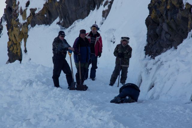 Монотонное тяжёлое движени по подваливающемуся снежовскому путику (а другой дороги просто нет), плавно вело нас в следующую бухту. На очередном пригорке Николай и заметил побёскивающие машины с фигурками суетящихся.