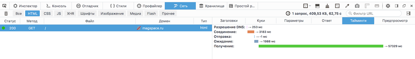 Нажмите для просмотра прикрепленного файлаУ магспейса с оптимизацией движка хуже - у них за 1.5-2 секунды сервер страницу генерирует. При этом у них и вес страницы больше, качается оно дольше (тут я загрузки не дождался, отменил, так оно еще дольше открывается).