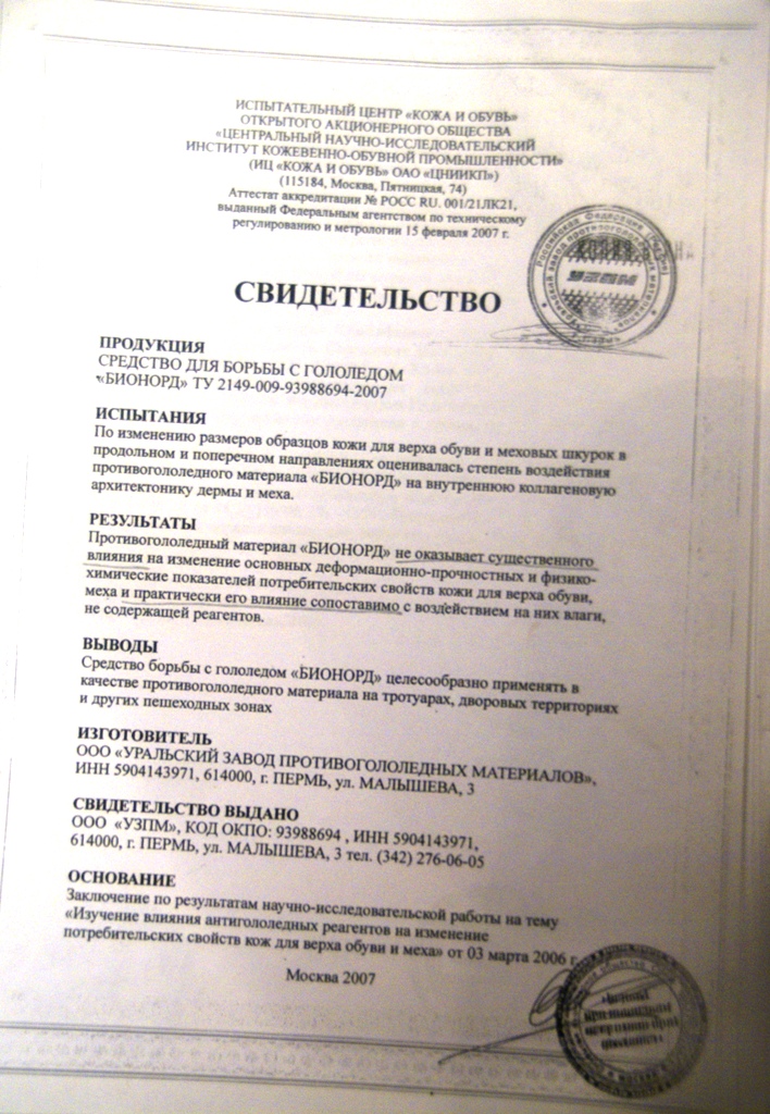 его влияние сопоставимо с воздействием на них влаги, не содержащей реагентов" выдано на основании результатов научно-исследовательской работы от