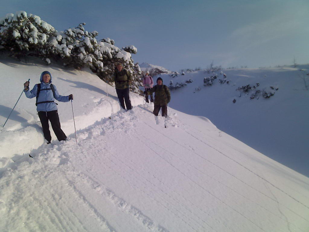 ФЫВА, hanabi, tpavel, +двое) автобусом №5 на 8-42. Первые 4 км были пробиты днем ранее в субботу старшим поколением во главе с четой Голдычей. Пенсионеры-завсегдатаи лыжни нас и догнали за Развилкой, выехав в 9-30. Самый засадный участок - подъем на перевал со Снежки нам помог пробить в рыхлом снегу