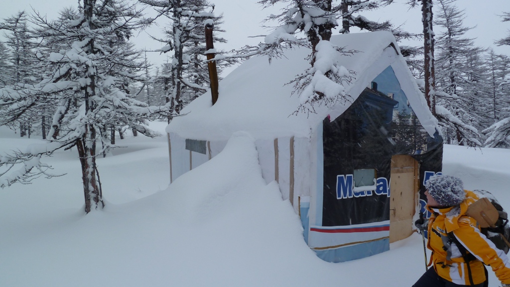 А потом пошли раскапывать "Приют Лето". Там с октября никого не было, так на самом верху геологической палатки, на коньке, толщина снега была под метр!