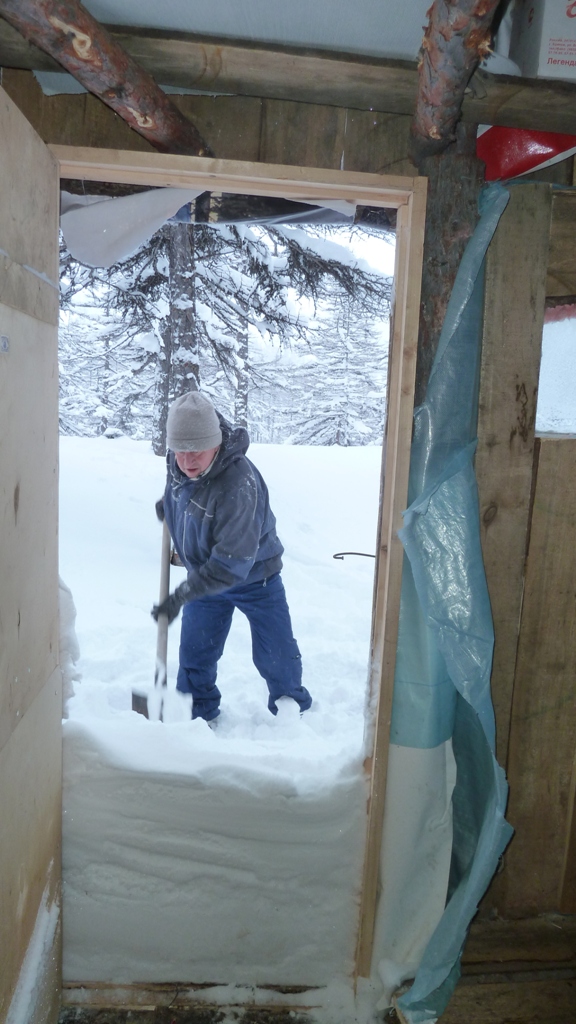 дверь замело где-то на 0,7 метра, открылась внутрь легко, хотя повело раму. Откопали и дверь и крыльцо. Крыльцо- это очень хорошо!
