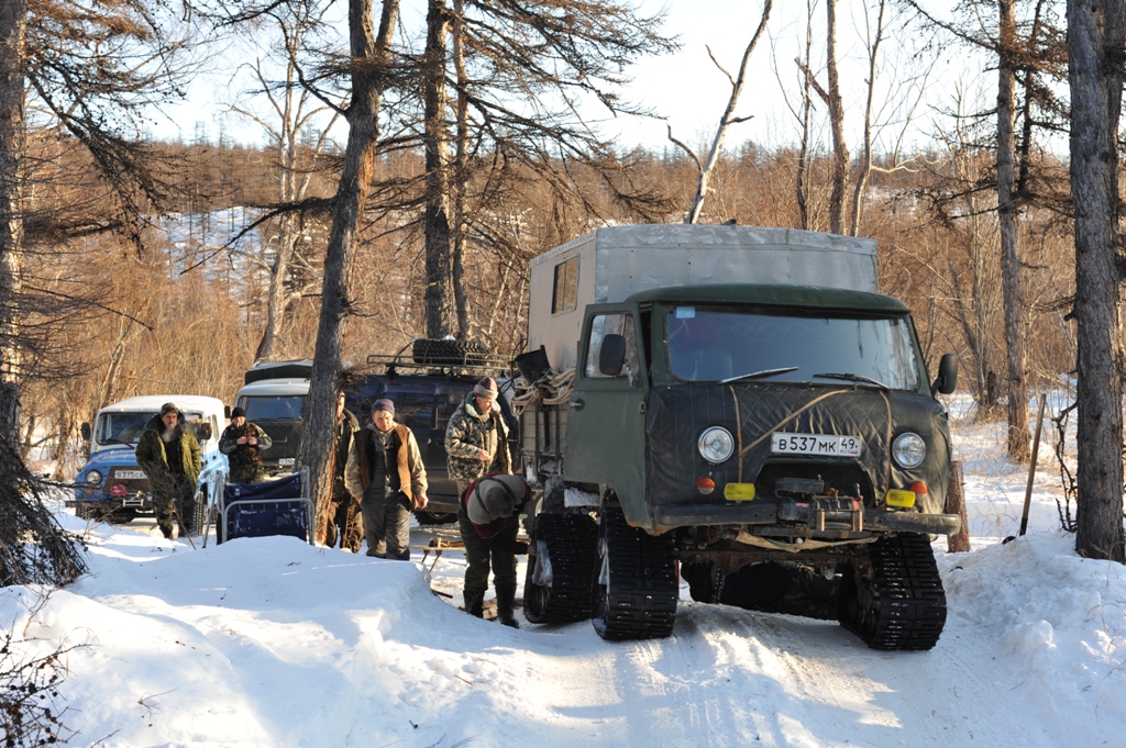 Вчера в 23.00 приехал домой. Забрали ребята на стандартном прадике. Перед серпантинами нехорошее место. Помогли ребята на нормальной машине с лебёдкой. Сначала себя вытащили, потом и нам помогли. Туда уехал 18 января на снегоходе. Ехали по нупам двое суток. Перед нами проехали погранцы на вездеходе. Сильно пуржило и была сильная оттепель. первая ночёвка на 4 нупе. Вторая на 5-ом. Как заметили - печка там всё таки есть. Уже в сумерках нашли флягу из под краски, вырубили бочину и вставили трубу. С горем пополам переночевали. Рыбу не ловил, но "поселенцы" за неделю поймали меньше, чем по мешку. Краба нет даже в Найдёнке. Лёд от Тупого встал и довольно крепкий. По всей видимости в выходные можно будет пробовать на транспорте проехать. На выходные поед снова, видимо придётся "автостопом", так как снегоходы на Корейском - остались рыбачить. Сам выехал за продуктами и топливом.