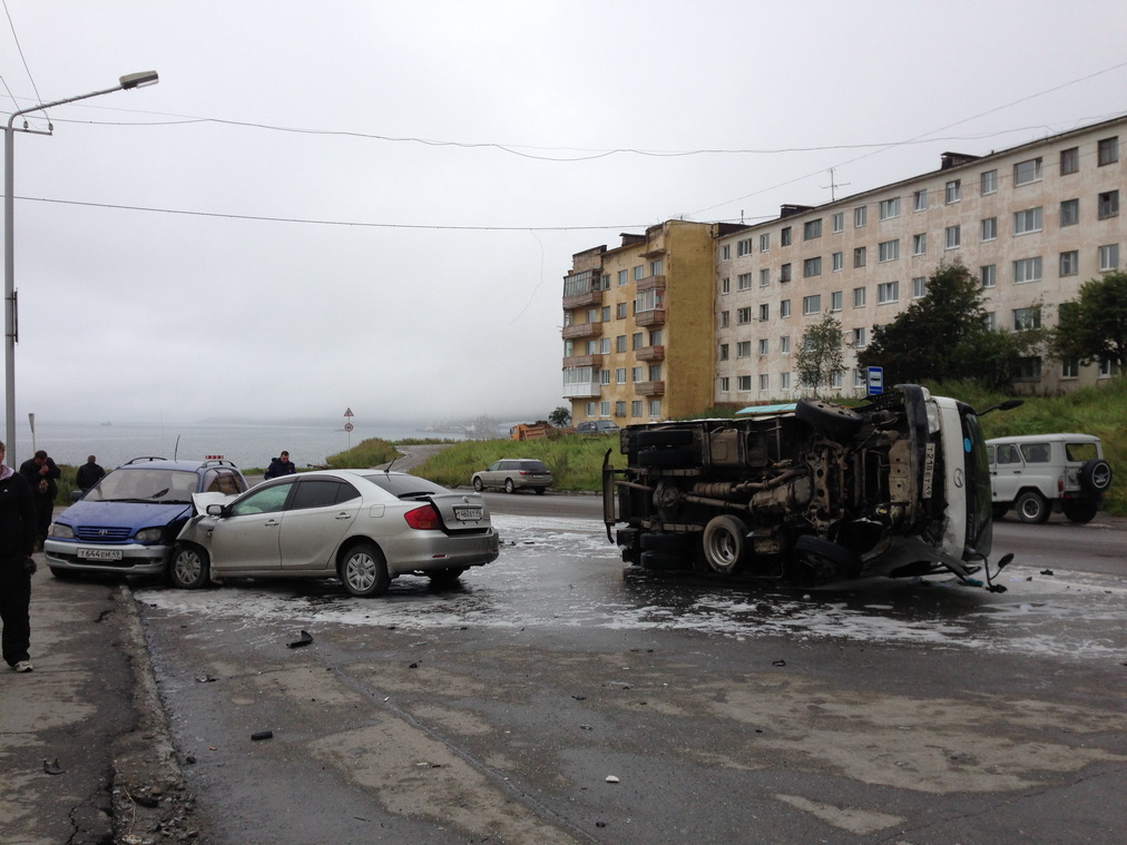 Три машинки в кучку... Грузовичек японский (с будкой) лежит на боку, его пожарные пеной заливали (скорее всего топливо с бака), Тойота Ипсум сине-голубого цвета и Тойота (по моему Аллион)... последняя очень сильно повреждена в правую переднюю часть.... да в принципе там морда вся битая... Ипсум такое ощущение вообще стоял возле обочины, а в него прилетело.... Что как было не видел, видел только последствия...