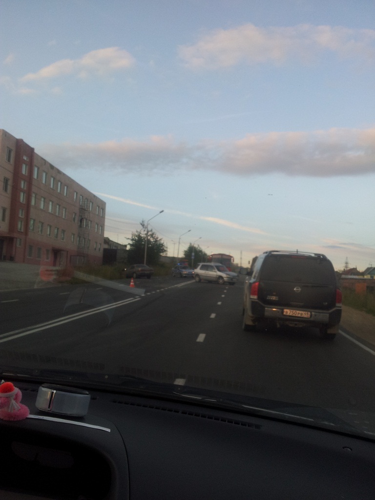Камрюха на обочине(обочина складов) правая часть морды сильно смята, правое переднее колесо вывернуто довольно не хило. Видел это происшествие в 21.15