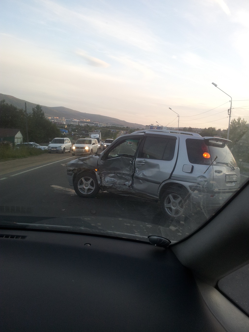 Не Теранчик,а Мистрал.Мистрал ехал со Снежной долины,перед выездом на трассу"со слов водителя Мистраля" у него заклинил руль и он не смог повернуть. вот и поймал Уаза.Водителю Уаза понадобилась помощь врачей,что то с плечем.