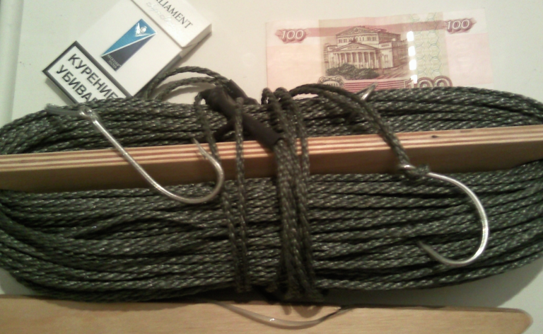 К 25-30-метровому куску лески 0,80-1,0 мм привязывают свинцовую отливку от одного до полутора килограммов весом. К этой же отливке, для удобства заброса, привязывают полуметровый кусок веревки. Вверх от груза, с интервалом около 2 метров, привязывают к леске полуметровые поводки, чуть тоньше основной лески, до пяти штук! На каждом поводке - легкая вращающаяся блесна. Свободой конец лески на берегу привязывают к колу.