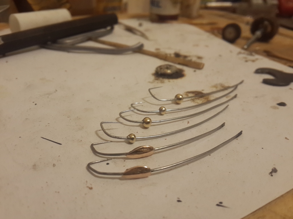 Если делать напайки типа "кобр" то для этого лучше использовать фольгу из нужного металла, которую надо напаять на иглу. А если делать блесну как на фото то надо обтачивать - это долгий процесс, я это делаю при помощи инструмента Dremel. Кобры быстро делаются, вырезал ножницами, припаял, полирнул и все. Для фиксации лучше использовать хирургический зажим для сосудов - он фиксируется хорошо. Вообще профи делают эти дела гораздо быстрее, у меня все это долго происходит потому что отвык.