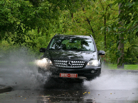 А что касается обычной такой грязюки, где легковушка не пройдёт, а мотоцикл и вовсе завязнет, — тут всё замечательно! Mercedes ML350 тащится по размытой дороге, перебирая своими 19-дюймовыми колёсиками — обутыми, правда, в слишком уж низкопрофильную резину, которая не позволяет ровно держать траекторию и постоянно вынуждает барахтаться в колее. При этом ещё приходится активно звать на помощь систему 4-ETS (Four Electronic Traction Support), которой иногда неплохо удаётся угомонить буксующие колёса.