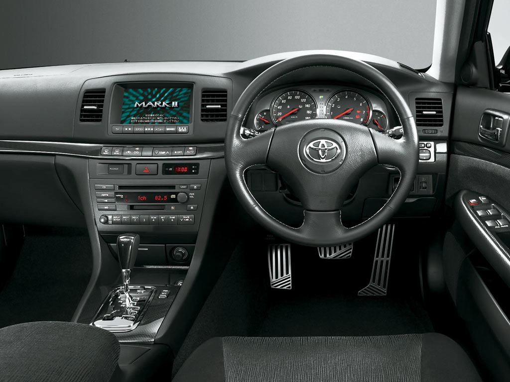 Как известно, семейство автомобилей Mark II подошло к такой точке своего развития, когда должно было появиться на свет уже десятое поколение. Было решено в ознаменование этого события внести изменение в название и заменить порядковый номер II номером Х (латинские цифры). Эта новая модель заняла своё место в ценовой категории «выше среднего». Она выполнена на общей с моделью Toyota Crown платформе, оснащается шестицилиндровым V-образным двигателем с рабочим объемом 3 либо 2.5 литра. К двигателям прилагается 6-ступенчатая коробка передач типа Super ECT, в которой предусмотрен режим ручного переключения. Если учитывать то обстоятельство, что нынешняя модель выпущена в развитие модельного ряда Mark II, то выходит, это – первый случай, когда компания Тойота разрабатывает модель такого класса с 6-цилиндровым V-образным мотором. И еще, судя по всему, было решено не ограничиваться формальной заменой «двойки» на «десятку», а пойти далее и выбрать для новой машины до этого невиданный внешний вид. Чтобы убедиться в правдивости подобного утверждения достаточно только взглянуть на переднюю часть машины, на то место, где прямо из-под бампера и вплоть до капота тянется рельефная линия в виде буквы V. Затем нужно глянуть на 3-х секционные передние фары, затем обойти машину сзади, чтобы открылся вид на выхлопную трубу, расположенную под массивным задним бампером. Все это стоит увидеть. А затем сесть в салон, наполненный кожаными, металлическими и деревянными элементами, в частности, оценить среднюю консоль передней панели. И только тогда поймешь, что это такое, качество отделки, как его понимают дизайнеры компании Тойота! Автомобиль спортивной комплектации «S package» оборудован 18-дюймовыми алюминиевыми колесными дисками и тормозами спортивного типа, специально перенастроенной подвеской, аэродинамическими деталями кузова и прочими «приятностями». Стоит заметить, что система полного привода (4WD) устанавливается только на модификацию с 2.5-литровым мотором и 5-ступенчатой автоматической коробкой передач.