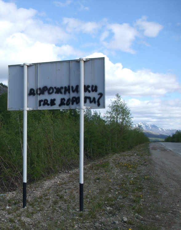 Дорога после Карамкена, особенно перед Яблоневым, совсем не айс, но это кроме скорости ни на что не влияет. Хотя у кого-то нервы сдали...надпись встретили отчаянную: "дорожники, где дороги???"