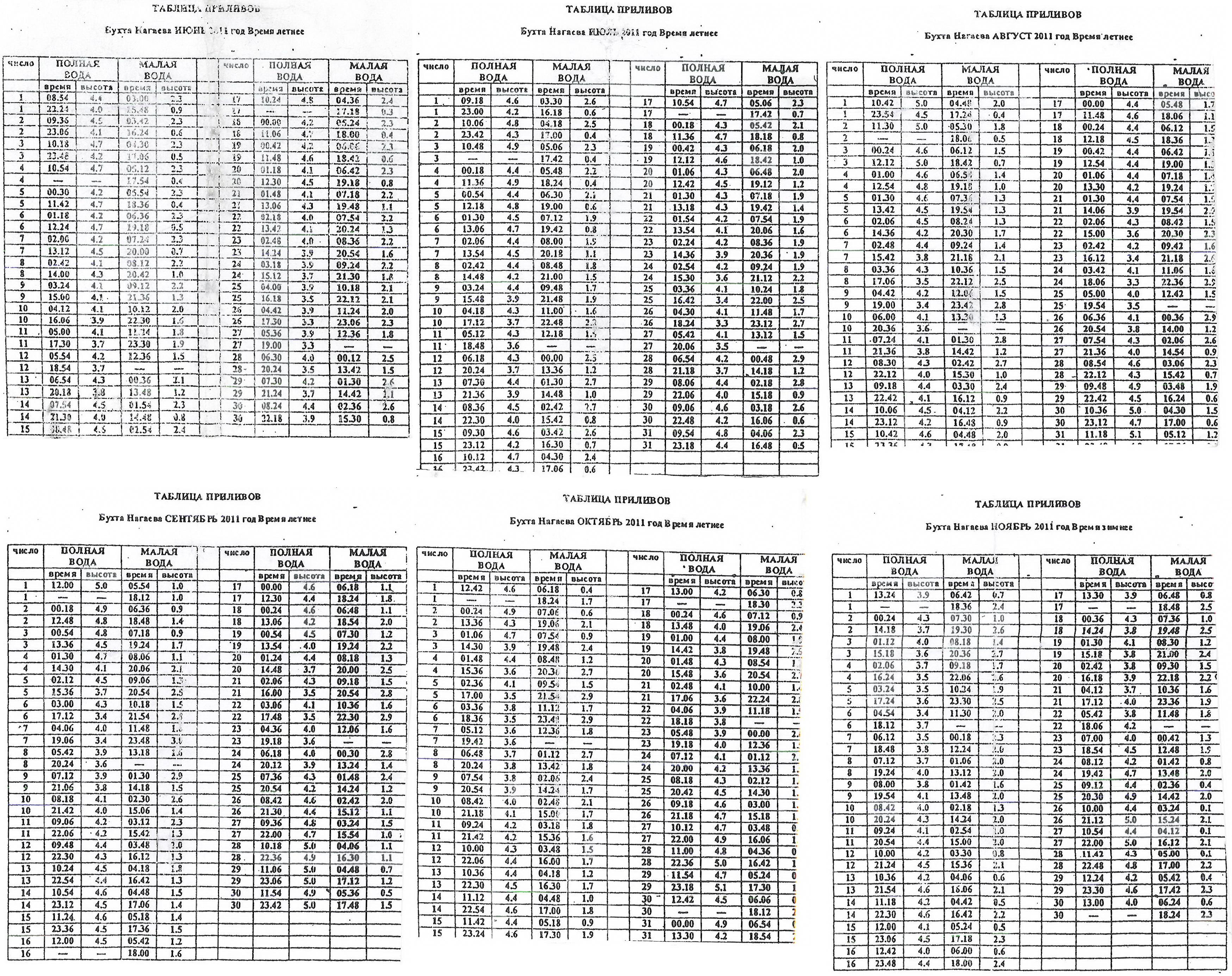 Таблица приливов бухта Нагаева 06.2011 - 11.2011
