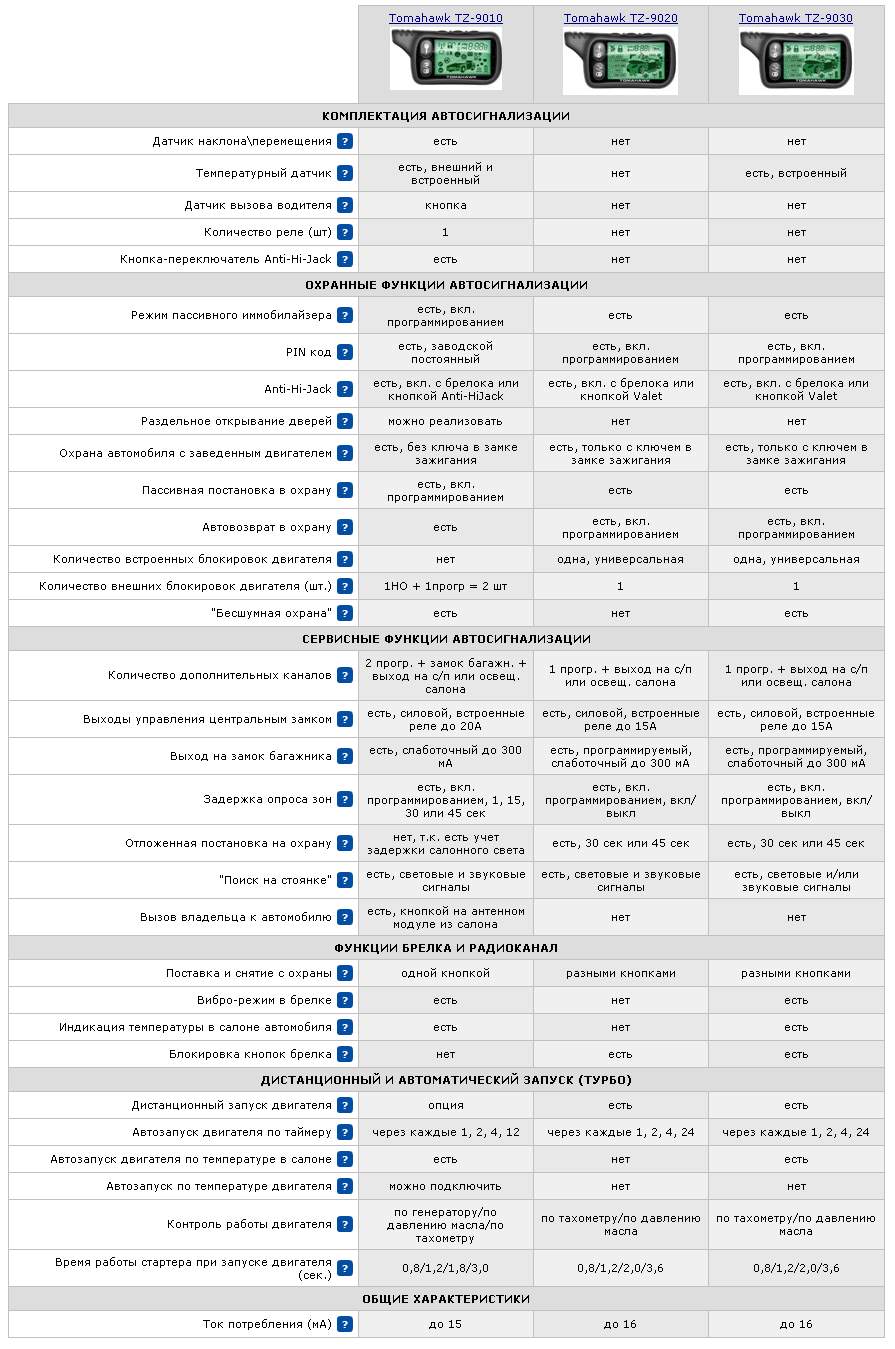 Таблица отличий Tomahawk TZ-9010, Tomahawk TZ-9020 и Tomahawk TZ-9030