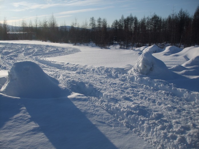 гольфа катания. Сегодня проехал по периметру большого поля, получил хорошую порцию адреналина (полноприводной стоковый седан). Но колею(считай дорогу) для недоприводов накатал. Середину поля не трогал, чтоб не ломать кайф любителям. Немного страшновато за "табуретки" с "пипетками", из-за малого клиренса, будут пузами по снегу елозить. Но в общем строю, думаю проползут осторожненько. А потом сделаем нормальную дорогу.
