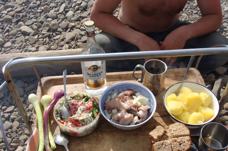 По плану первая ночевка должна быть на речке Гербе, наОмсукчанской трассе. До нее доехали совсем без проблем, пыли много не было ижара особо не донимала. И мы не спеша к вечеру докатили до места стоянки.Расположились и Владимирыч поймал первую рыбку на ужин