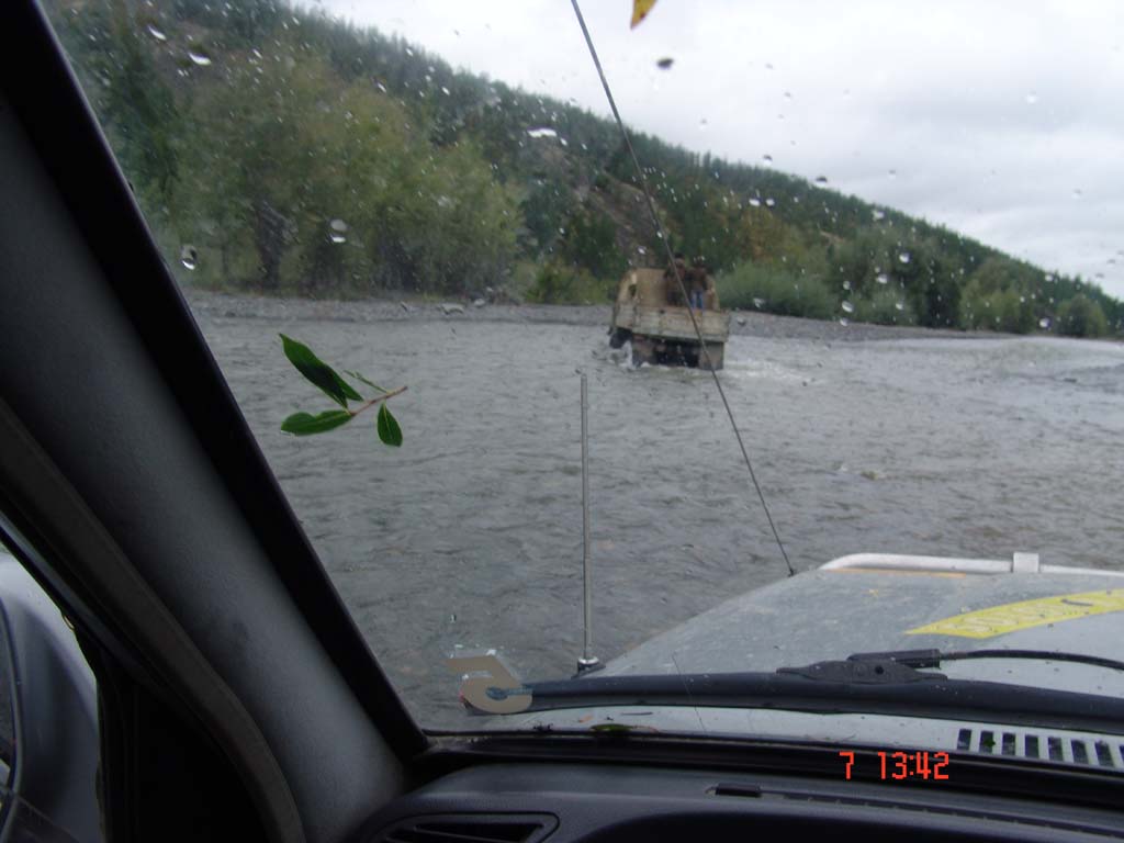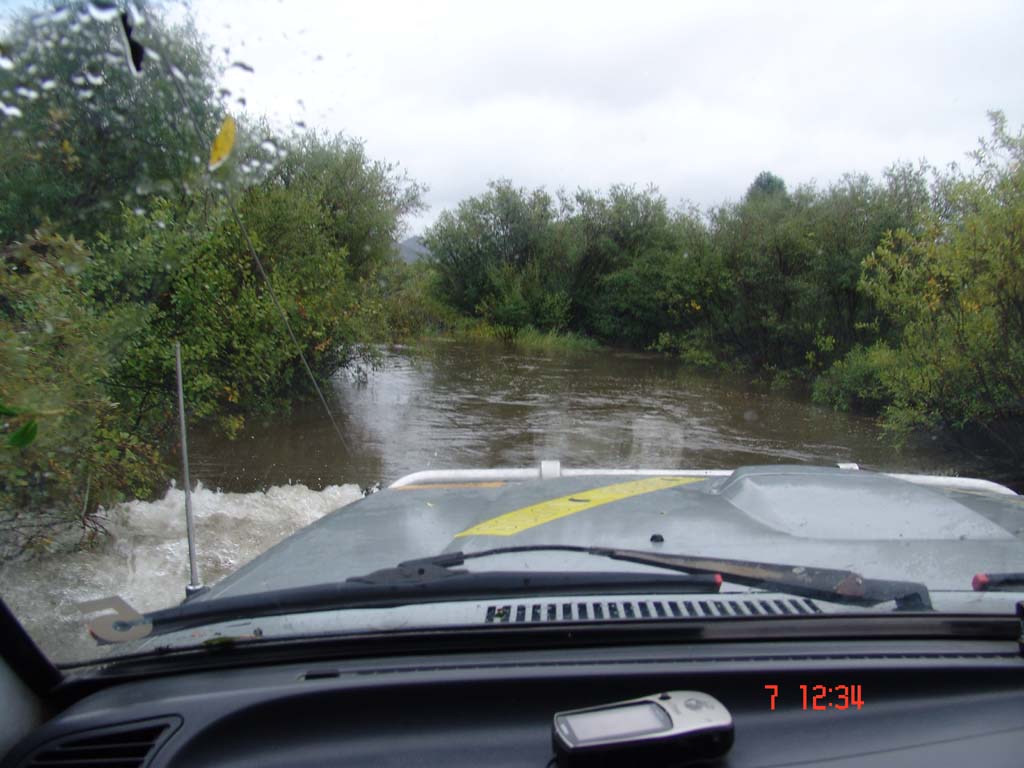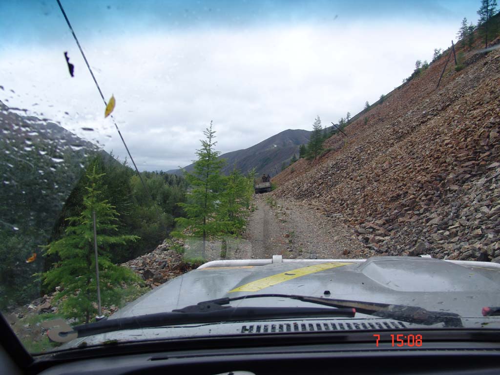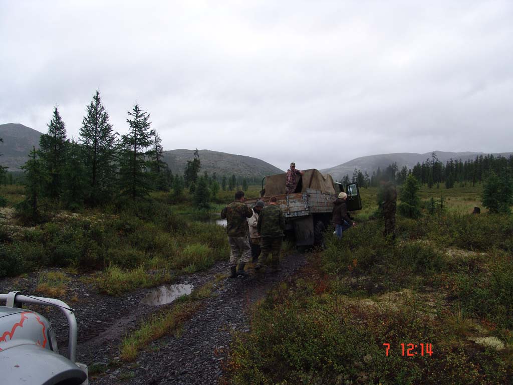 299:ледник.jpg]Часть 2(продолжение).Приехав на озеро увидели возле домиков шишигу.Ну думаем облом с ночёвкой.В итоге после знакомства со всеми, были определены на ночёвку.Дождь шёл не переставая,и ставить в лесу палатку ,а потом и спать в ней, было чем то нереальным.После пробуждения утром нас обрадывали,проливной дождик поднял уровень воды в ручье.Это означало, что вода уже поднялась во всех окрестных ручейках и речьках.Решили не ждать, а выдвигаться в путь.Хотелось очень сгонять на Бохапчу порыбачить,но незная толком дорог, ехать в такой дождь на одной машине было страшновато.На общем сборе решили ехать в паре с газ 66 по Армани.Приводились аргументы в пользу этого пути."Дорога" короче на 30-40км,двумя машинами попроще и плюс мы там не разу не были,глянуть дорогу.На вопрос сколько бродов серьёзных,сказали 5 не больше.Если бы я представлял эту дорогу,никогда не подписался ехать по Армани.В итоге бродов оказались штук 30.В некоторых плыл и 66 по борта.Но самое первое испытание поубавившее пыл оказалось болото ,находяшееся недалеко от озера.Это то место, которое сфотано в этой теме раньше, где 66-ой с кунгом лежит в луже, или жиже.Говорят туда весыпали 5 камазов камней.Нам была предложена дорога в обьезд по кочьке.Прошли мы, глянули,тоже не подарок,вокруг всё мягко,деревьев нет(лебёдку зацепить не за что)а самое главное спасители на шишиге не подьедут и близко.Посадили в итоге меня за руль(типа если засадит будет поорать на кого).Я решил ехать по пути Газона,если застряну хоть дёрнуть можно будет.Все блокировки активизированы,газ в пол (вывози родная).И выскочил как пуля,правда в одном месте всплывать начал(аж жижа в салон затекла).Дальше дорога пошла по долине, мимо огромного ледника.Этот участок показался асфальтом,по сравнению с другими.Подьехав к верховьям реки Армань, мы были немного шокированы количеством воды.На вопрос где тут дорога,было указано на речьку.Перед плаваньем поставили столик,достали еду ,чай в термосе и не только чай.После небольшого перекуса,сказав с Богом,двинулись бороздить просторы Армани.Где ехать, я даже представить себе не мог,хорошо впереди шёл наш целеуказатель.В некоторых местах шишига ныряла в лес.Причём с реки заезда видно не было.Пацаны молодцы,если мы теряли их из виду ,останавливались,и даже возвращались за нами, недождавшись.По лесу есть куски старой дороги ,вполне пригодные к проезду,они, т.к. местные, их хорошо знают.По выезду с озера нам было сказано, что ехать будем потихоньку, на 2 скорости.Ехали они на 2ой космической наверное,догнать их было местами очень сложно.Пару раз дорога выходила на осыпь(крутая сопка,дорога посередине и обрыв внизу метров 100).В одном месте пришлось становиться на подножку, из-за опасности перевернуться. В одном месте остановились прям на осыпи и нам показали на вход в шахту на другой стороне реки,в сопке.Там добывали касетерит, из которого в итоге выплавляли олово.Один из местных поднимался на сопку ,заглядывал в шахту.Метров 7 прошёл,на полу лёд,а дальше не рискнул,своды шахты сгнили и в любой момент могут рухнуть.Рядом через речку стояла фабрика,от неё уже остались только куски бетона.От этого места если пройти 7км в сопку,есть озеро Голубое находящееся на вершине сопки,в кратере.Дорога правда заросла и местами обрушилась,поэтому только пешком.А если пройти 25 км будет заброшеный п