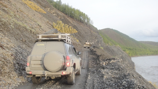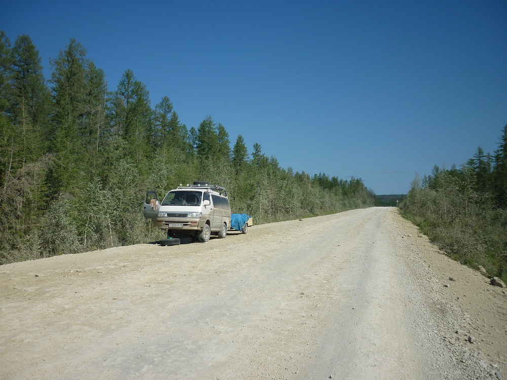 30.08.12 - ремонт в Хандыге, заварили капот, отремонтировали лопнувшую тормозную трубку. Спать я отказался, очень хотелось домой. Выехали в 21.20, проехали прижимы ночью. В конце черного прижима были ремонтные работы, нас тормознули на 3 часа, мы как раз поспали. Дальше дорога более менее нормальная, от Кюбюмэ до Усть-Неры хорошая грунтовка. Впечатлил Ольчанский перевал своим величием, обалденное место! Байкал просто нервно курит в сторонке. Доехали до реки Делянкир к вечеру 31.08.12, ночевали на берегу . Пройдено 768км.