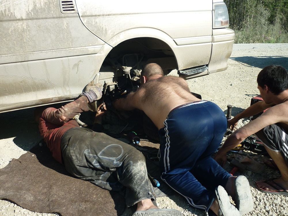 29.08.12 - выехали в 04.20. Асфальт закончился и началась грунтовка полный писец, сломались оба крепления капота, левая задняя пружина. До Качикатц дороги нет, есть только направление движения. После асфальт и грунтовка на 2+ до Чурамчи, далее до переправы опять задница. Прокололи колесо, быстро поменяли и все таки успели на переправу, в 19.50 залетели на паром последнии. На пароме уже стояли две Магаданские машины. С Кескиля до Хандыге отказали тормоза, я порывался ехать дальше без них, зачем они нам, их трусы придумали, но мой штурман (он же моя вторая половинка)