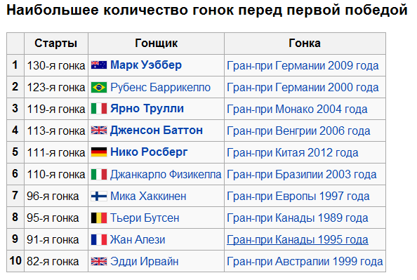 Нажмите для просмотра прикрепленного файлаИз действующих пилотов теперь лидируют по этому показателю де ля Роса (86 ГП, 85 стартов) и Глок (75 ГП, 72 старта).