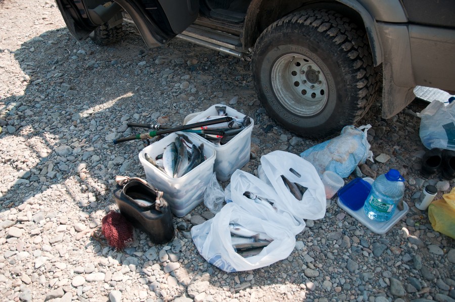 Т.к. было жарко, рыба ушла на глубину и не ловилась совсем, даже в сеть не заходила... Но на третий день перед отъездом наловили немного окуня (ловился он на гальяна)