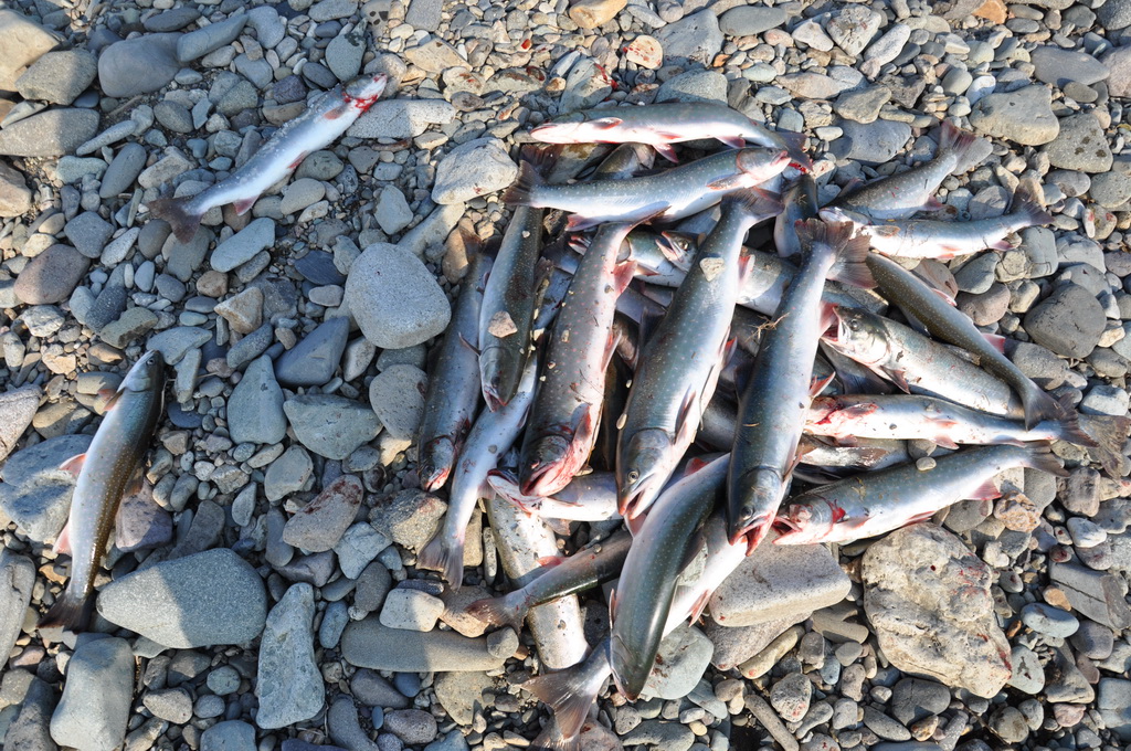 Все экземпляры, которые поймал отдал тому мужику. Он сказал, что нет ничего страшного в том что рыба с Магаданки, он её вымораживает, и спокойненько ест, по его заверению рыба чистая. На вид голец как голец, без явных каких либо изъянов!