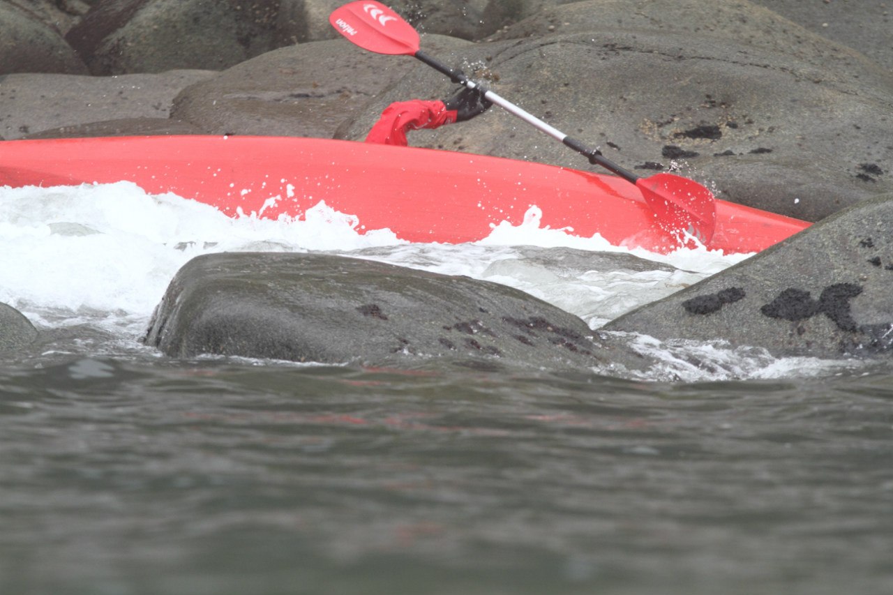 Выходя в море я успешно перевернулся, меня сразу накрыло второй волной, вылез из лодки, вытащил на камни каяк и с десятой попытки все-таки выпихнул себя в море. Удивительно, но опять остался полностью сухим — каякерская снаряга это не хухры-мухры.