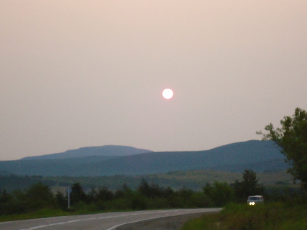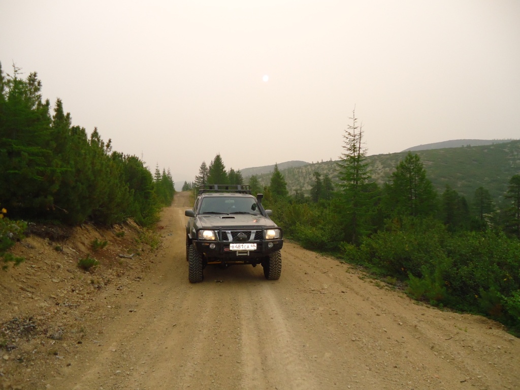 Выезжаем утром в 6 часов. Заправка, посещение гаражей, чтобы забрать необходимые принадлежности. Восход солнца в дымке горелой тайги