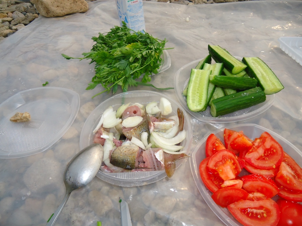 Готовим место под костер. После едем вниз – спускаемся на километра 2. Т.к. в запасе нет времени и отсутствует нужное количество топлива, исследование Асана оставляем на следующий раз. Сами же возвращаемся вверх и готовим обед. Это опять уха, но уже с местного хариуса. Она опять бесподобна…