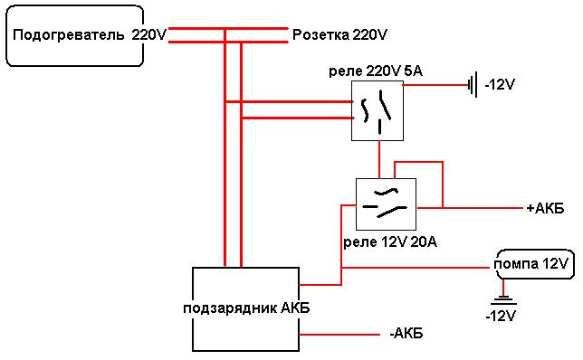 я так подключал помпу и подзарядник акб. Понадобится реле на 220 вольт, продается в магазинах вроде тринитрона. Если АКБ слабый, то стоит дополнительно поставить зарядник с конвертором на 12 вольт, который будет и батарейку заряжать и печку крутить.